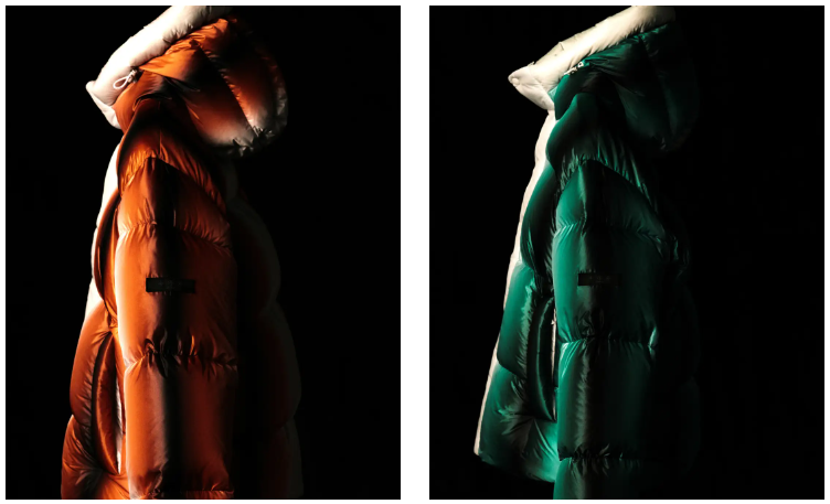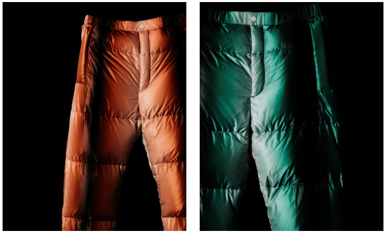 ダウンジャケット、ダウンパンツ、バッグの3アイテムを展開。それぞれ2色のカラーバリエーションで構成されており、日本の伝統技術である輪島塗(漆塗り)から着想を得た繊細なグラデーションが、アートとして各アイテムに落とし込まれています。漆の持つ奥行きある色彩表現をテキスタイルに昇華させることで、視覚的なレイヤーと深みを生み出し、伝統とモダンが交差する独自の存在感を放ちます。